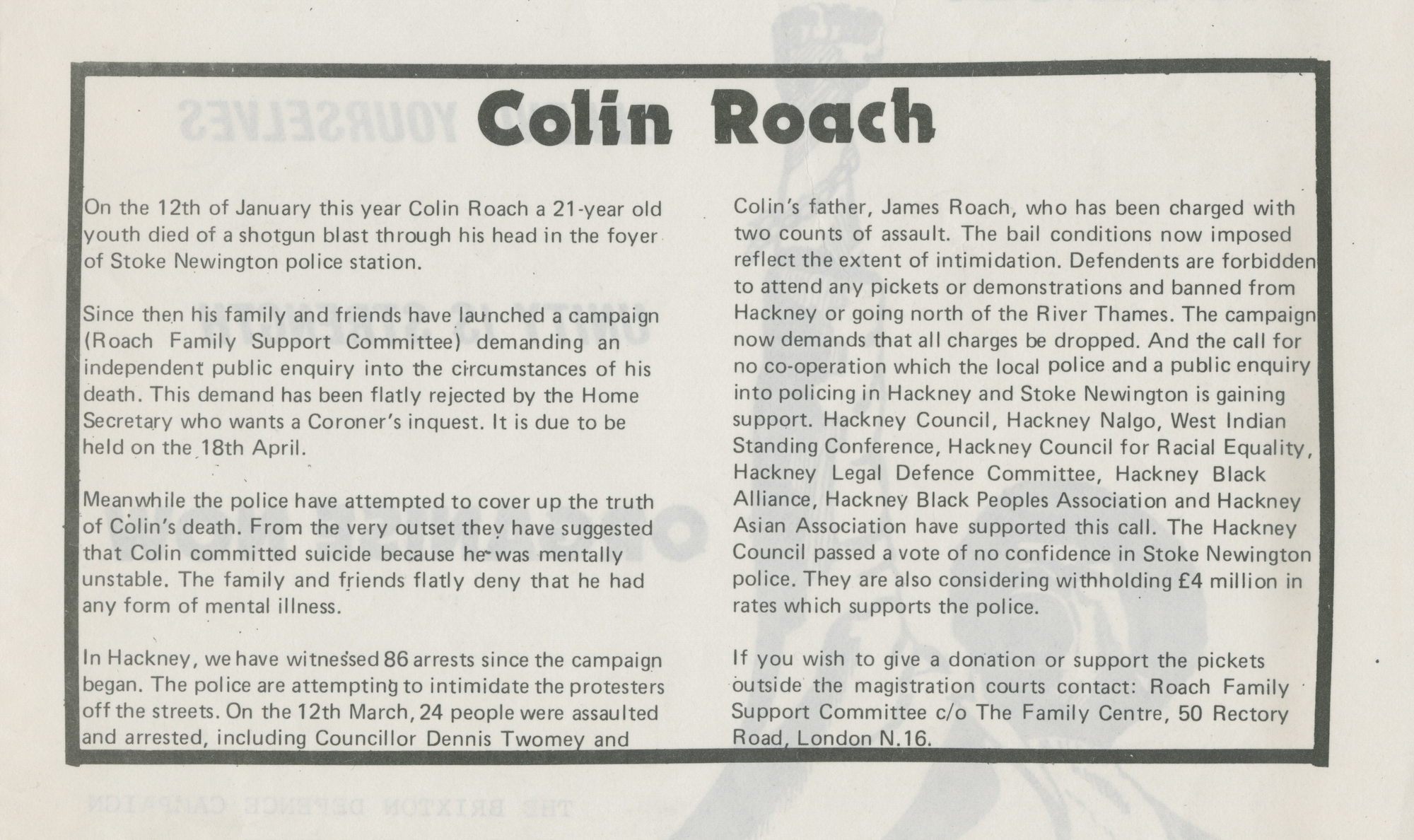 Who Killed Colin Roach? is Isaac Julien's first film, which reflects upon the death of Colin Roach, a 21 year old who was shot at the entrance of a police station in East London, in 1983.