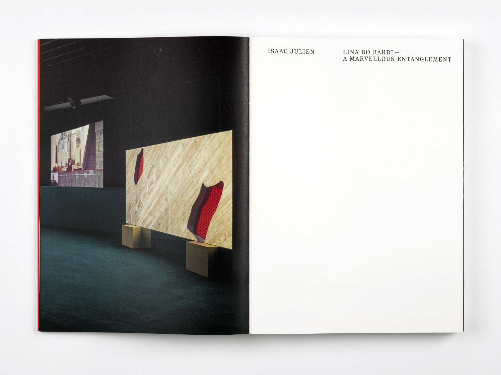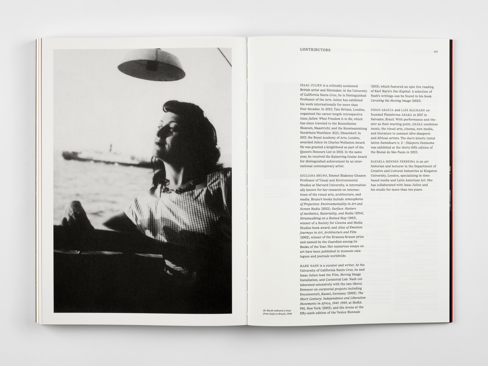 Lina Bo Bardi—A Marvellous Entanglement is a poetic portrait exploring the life, work, and legacy of the Italian-born Brazilian architect Lina Bo Bardi (1914–1992). The installation enfolds viewers in a narrative that exemplifies Bo Bardi’s observation that “time is not linear, it is a marvellous entanglement.” In this book, Julien combines elements of his recent film installation, works from his related photographic series, and a rich selection of archival materials, offering a deeper understanding of Bo Bardi and her influence. The publication features an essay by theorist Giuliana Bruno, a behind-the-scenes account of the project by curator and scholar Mark Nash, and a conversation between Julien and members of Brazilian art collective Araká, who performed in A Marvellous Entanglement. The book was designed by Katy Nelson.